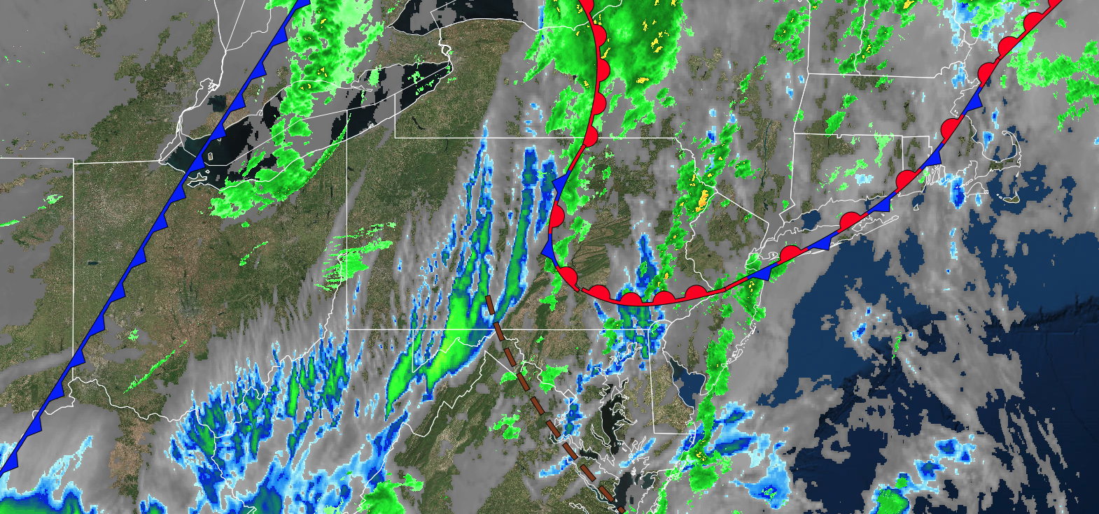 A warm front will lift through the region with variable clouds and widely scattered showers. A cold front will follow with waves of showers and thunderstorms in the afternoon and evening. A few thunderstorms in eastern Pennsylvania will reach severe levels with frequent lightning, hail, and wind gusts over 50 mph. Winds will be from the southwest at 10 to 20 mph. High temperatures will range from the upper 50s to the lower 60s on Long Island, mid to upper 60s along the immediate coast, lower to mid-70s in the Delaware River Valley, and upper 60s to lower 70s throughout the rest of the region.
