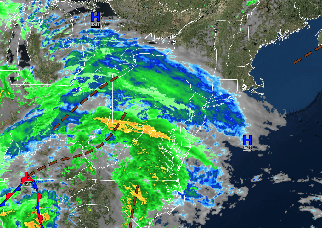 A trough will produce scattered clouds and isolated showers. Low temperatures will range from the lower to mid-40s over the interior, upper 40s to lower 50s in the suburbs, and lower to mid-50s in urban areas. High temperatures will range from the mid to upper 50s over the interior, lower to mid-60s along the coast, and mid to upper 60s in the Delaware River Valley.
