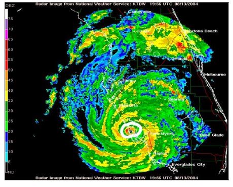 An NWS radar image of Hurricane Charley just after landfall on August 13, 2004, showed a tiny eye and eyewall.