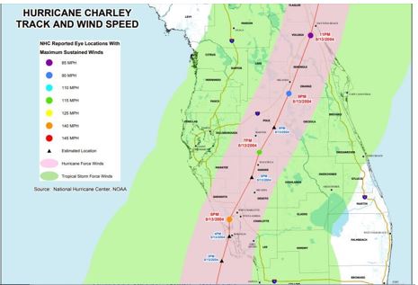 A map showing the track of Hurricane Charlie in the Florida Peninsula on August 13-14, 2004 – Map Credit-Lee County/NOAA.