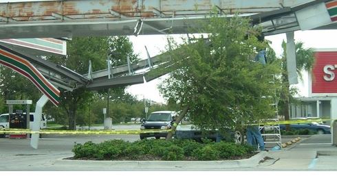 This photo shows damage to a gas station at Kissimmee, Florida on August 14, 2004, from Hurricane Charley. Photo Credit-Wikipedia-Public Domain.