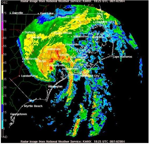 An NWS radar image shows a weakened Hurricane Charlie on August 14, 2004, in North Carolina.