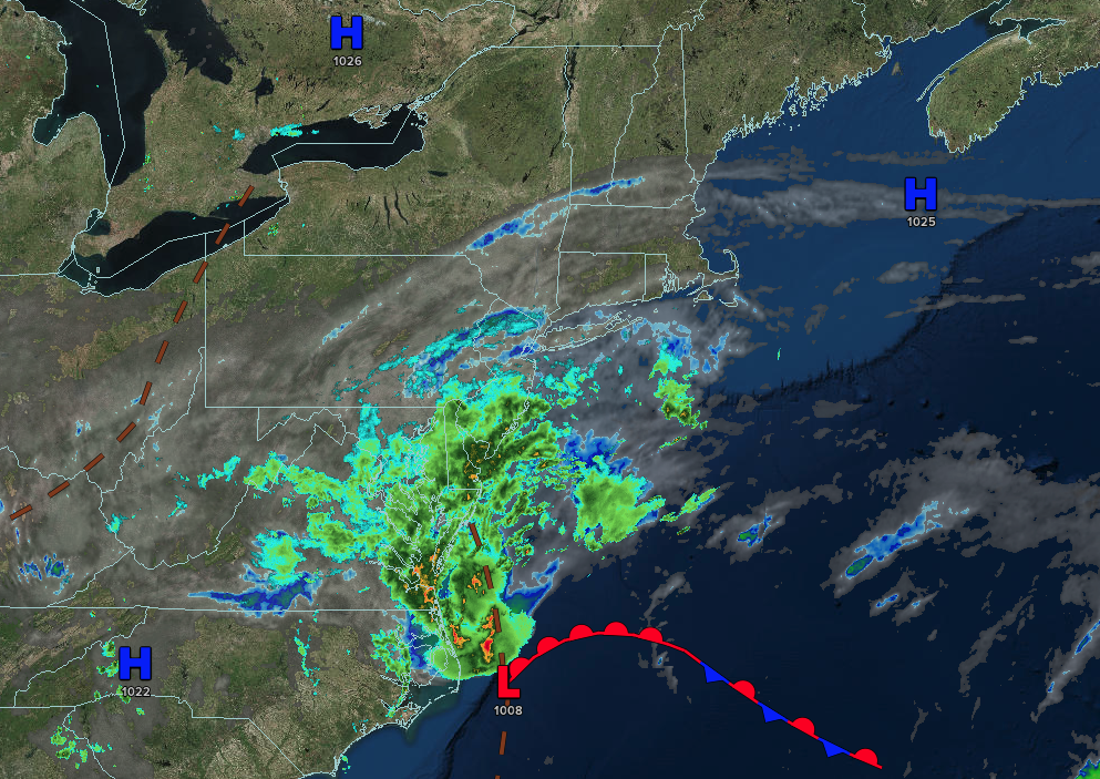 An area of low pressure over the coastal waters will produce overcast skies with isolated showers northwest of the I-95 corridor, scattered showers along the I-95 corridor, and periods of rain over southern New Jersey. Winds will be from the east at 5 to 10 mph. High temperatures will range from the lower to mid-70s.