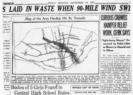 An image showing a September 30th newspaper headline and area of destruction in St. Louis Missouri following a tornado that struck the city on September 27, 1927. Image Credit- St. Louis- Post Dispatch Archives.