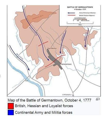 A map of the Battle of Germantown on October 4, 1777.  Map Credit-Wikipedia-Public Domain.