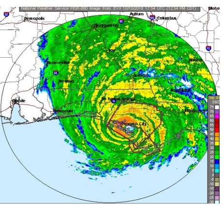 Radar image of Hurricane Michael on October 10, 2018, as it makes landfall just east of Panama City, Florida. Image Credit-NWS.