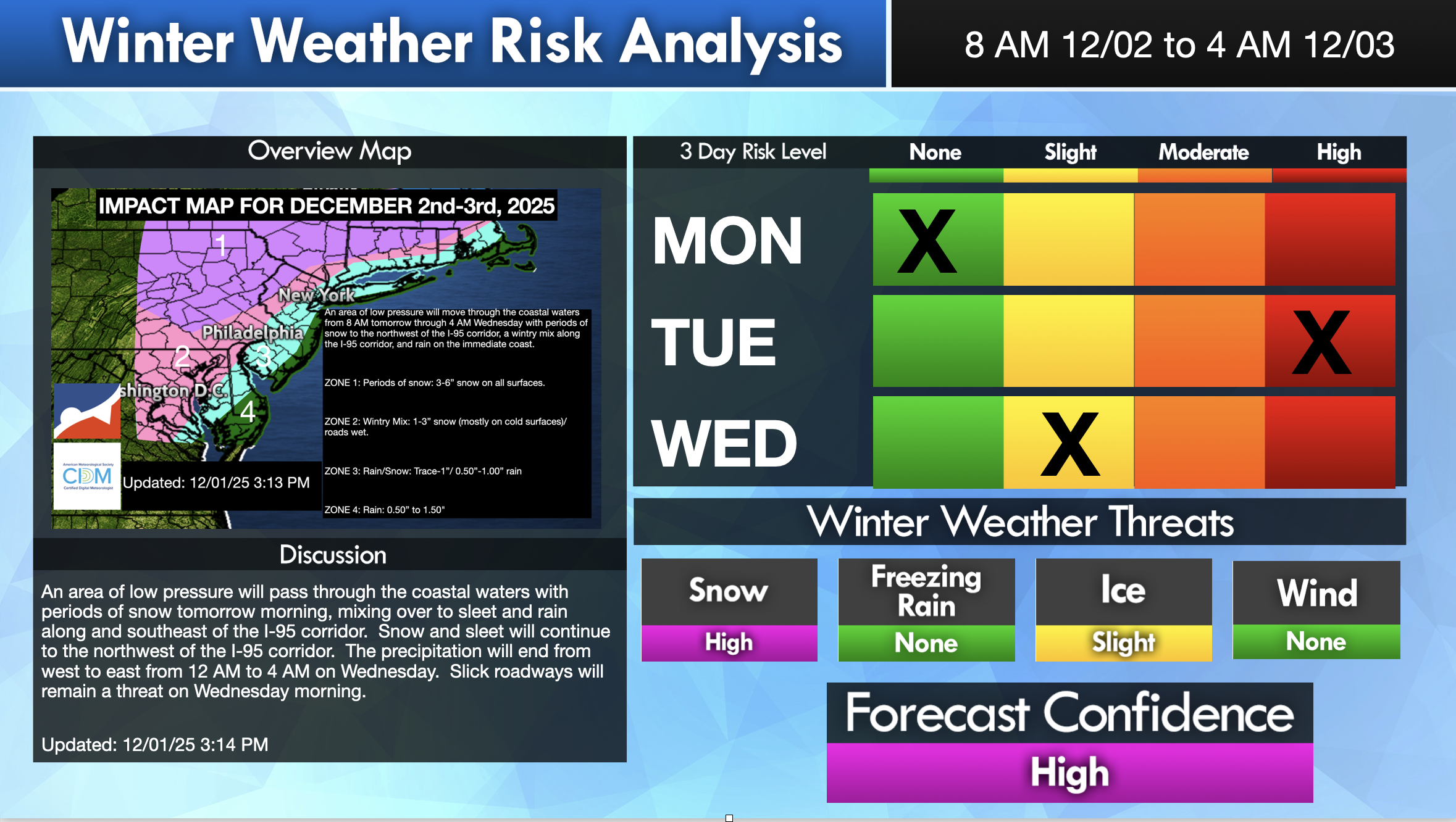 A winter storm will approach tomorrow with accumulating snowfall over the interior and a wet wintry mix on the I-95 corridor.  Cold conditions take hold into next week with some wintry precipitation a threat.