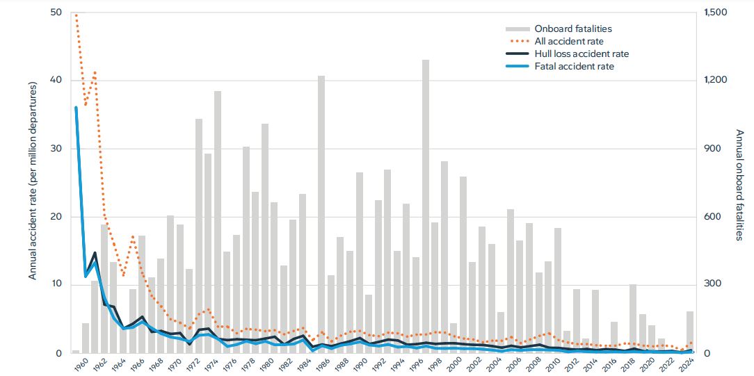 A graph showing a major decline in airline accidents and fatalities from 1960 to 2024. U.S. DOT stats.