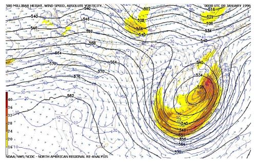 500 millibar height/vorticity chart valid at 0Z January 8, 1996, shows a closed low pressure system in the eastern U.S. Image Credit-NOAA.