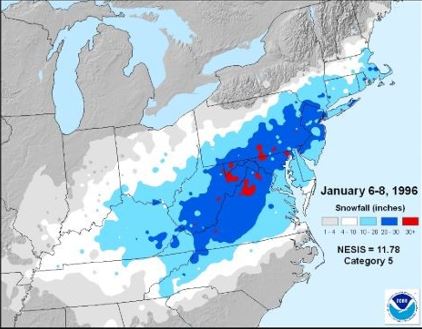 The blizzard o f 1996 is only one of two major snowstorms that are rated a “5” (extreme) on the NESIS scale. The other is “Superstorm” in 1993. High impact winter storms dating back to the late 1800s have been rated. The Northeast Snowfall Impact Scale was developed by Dr. Louis Ucellini and Paul Kocin (who I worked with at The Weather Channel).