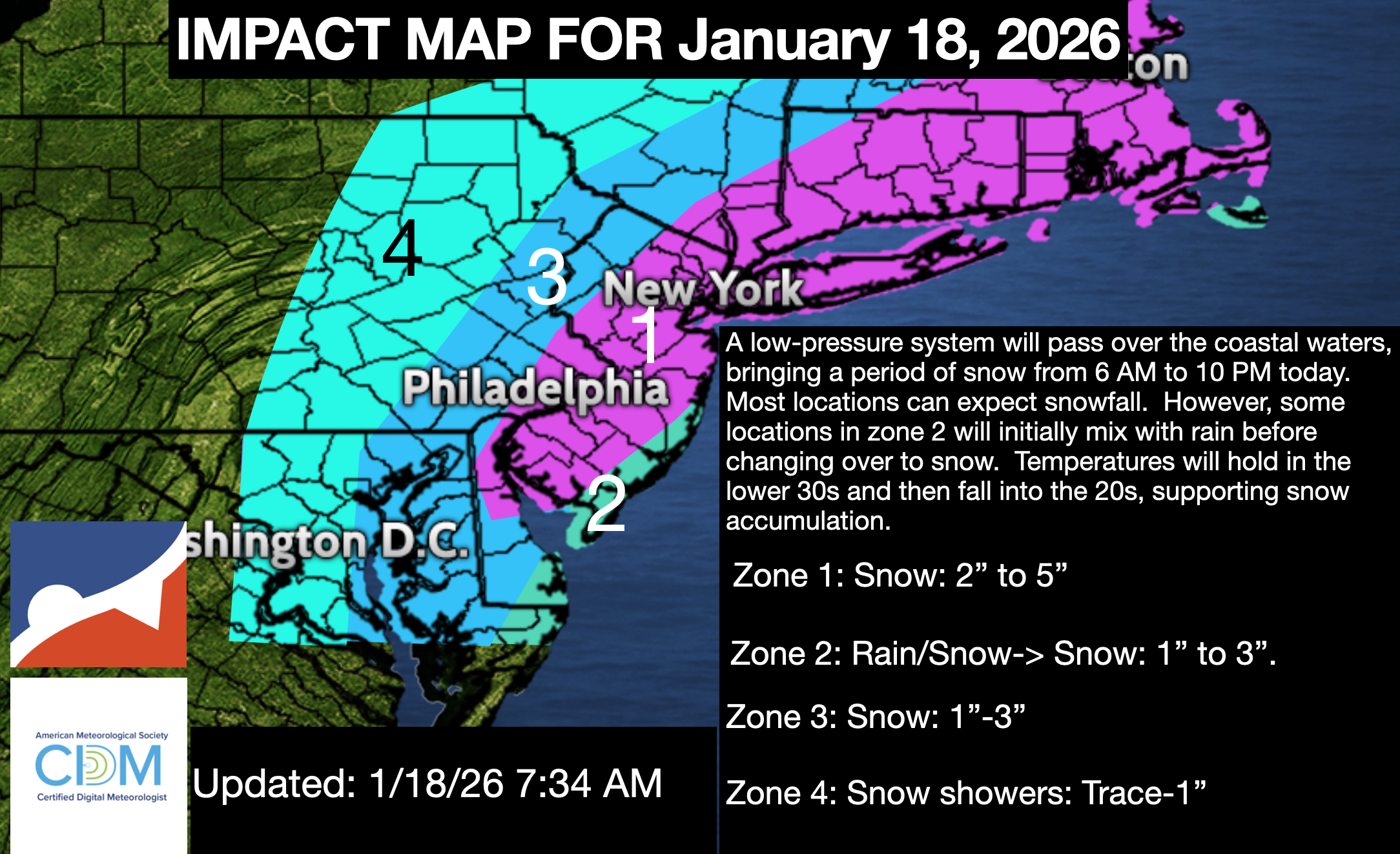 An area of low pressure off the coast will produce periods of snowfall throughout the region. Some rain will mix with the snow in southeastern New Jersey before changing over to snow. Winds will be from the southwest at 5 to 15 mph. High temperatures will range from the lower to mid-20s over the interior, upper 20s to lower 30s in the Delaware River Valley, and lower to mid-30s along the coast.