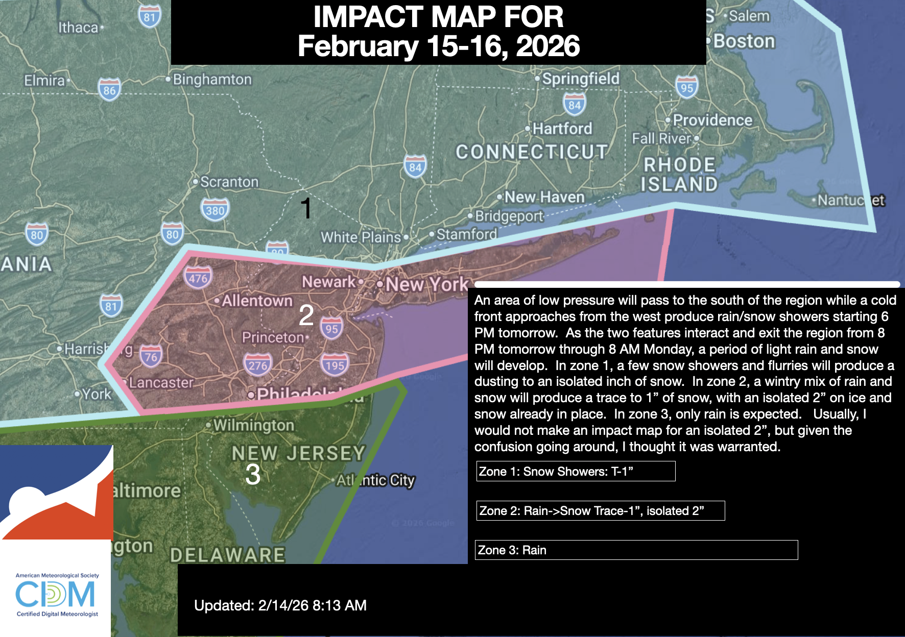An area of low pressure will produce periods of rain. Low temperatures will range from the mid to upper 30s. High temperatures will range from the mid to upper 40s over the interior, upper 40s to mid-50s in the New York City metropolitan area, and upper 50s to mid-60s in the Philadelphia metropolitan area.