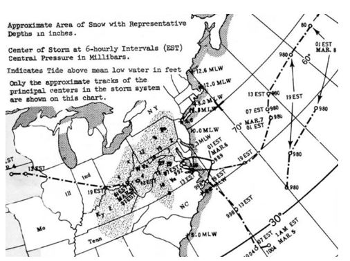 This map shows total snowfall and movement of the ‘Ash Wednesday” Storm” in March of 1962 (notice the loop in the storm track around the Del-Mar-Va area. There was a weaker secondary low that fizzled in the Ohio Valley. Map Credit-U.S. Weather Bureau.