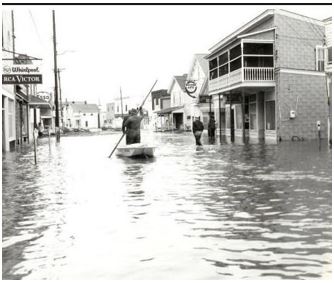 The photo shows a man navigating by boast on a flooded street on Chincoteague Island, Virginia, after the “Ash Wednesday” Storm in 1962. Photo Creditpinterest.com/David Parker.
