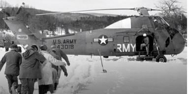 A photo of a helicopter that brought supplies to isolated residents of the Harrisonburg, Virginia, area during the “Ash Wednesday Storm in March of 1962.Photo Credit-Heritage Museum.