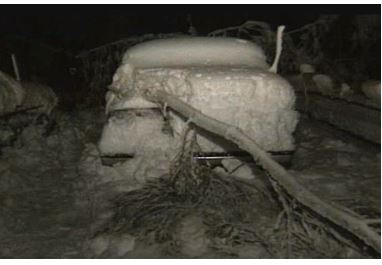 This image shows a large tree limb on a snow-covered car blocking the roadway near Boston Massachusetts on April 6, 1982. Image Credit- YouTube.