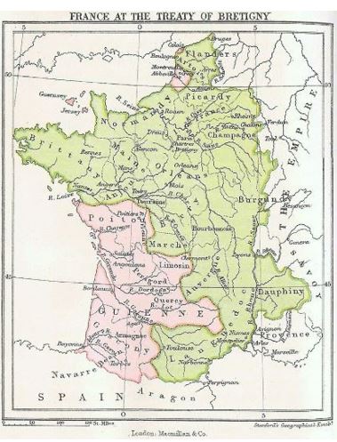 Edward left his lieutenants to negotiate with the French at a nearby town of Bretigny and he withdrew his army. A treaty was negotiated and signed. Edward would renounce his claim to the French throne but he would have full sovereignty over Aquitaine, Poitou, and Calais. The result is seen in the map below.
