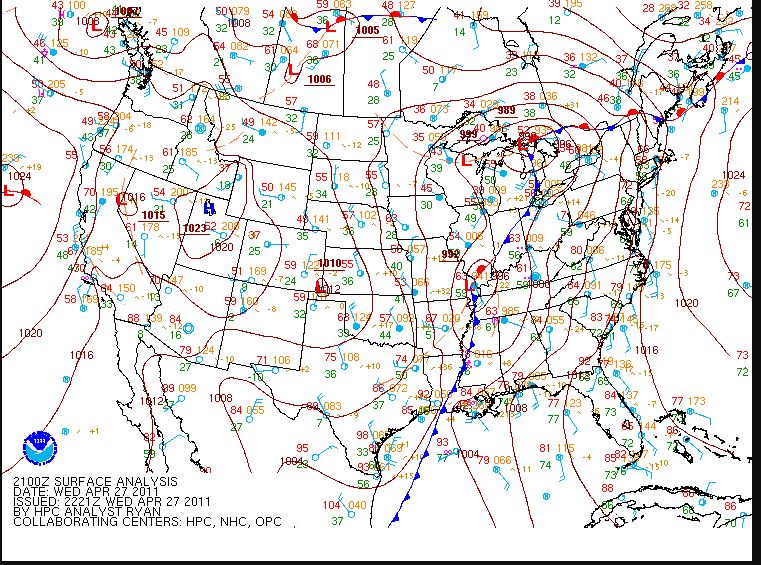 An HPC surface weather map for April 27,2011 showing low pressure crossing the Mississippi River with attending fronts.