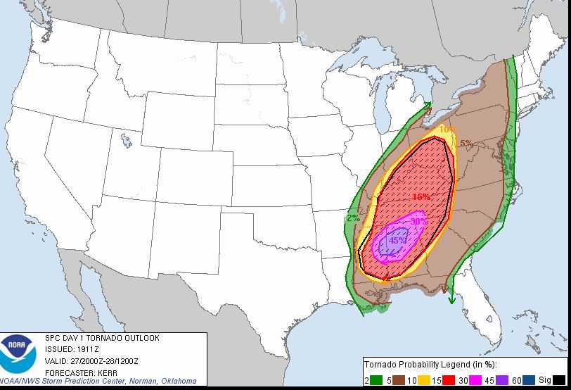 The SPC also indicated a high risk tornadoes from parts of eastern Mississippi to northern and central Alabama.