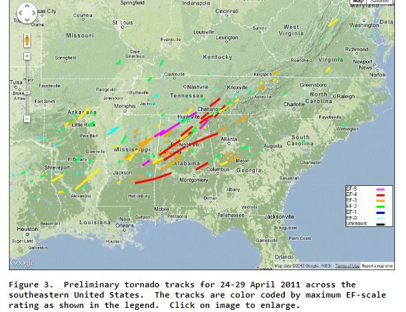 An NWS map showing tornado tracks and intensity in the figure below.