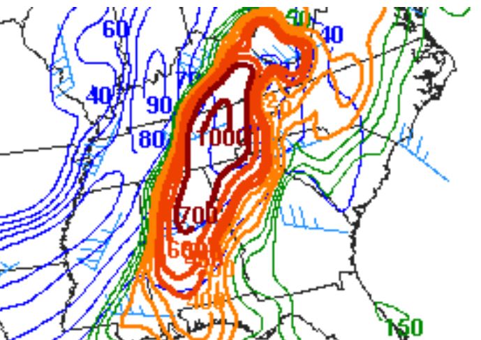 As the system moved eastward toward the Ohio, Mississippi, and Tennessee Valleys on April 27, a very powerful 80–100 knot mid-level jet stream, moved into the Ohio and Tennessee Valleys behind the trough and created strong wind shear along with a low pressure center moving quickly northeastward across those areas. Atmospheric instability was excessively high in the afternoon and evening. The Storm Prediction Center indicated moderate to high risk for severe thunderstorm from the Ohio and Tennessee Valleys southwestward to Mississippi and eastward to the Appalachians down into northern Georgia.