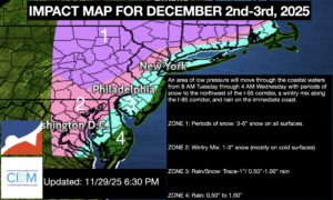 UPDATED 12/02/25 9:35 AM A winter storm will approach today with accumulating snowfall over the interior and a wet wintry mix on the I-95 corridor.
